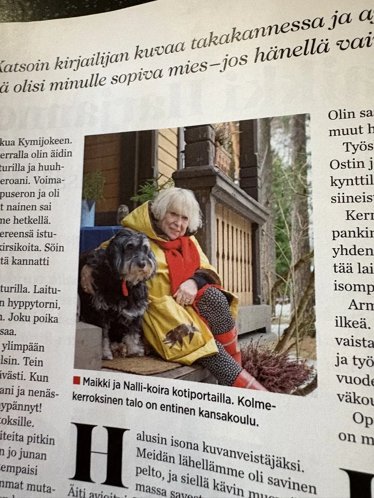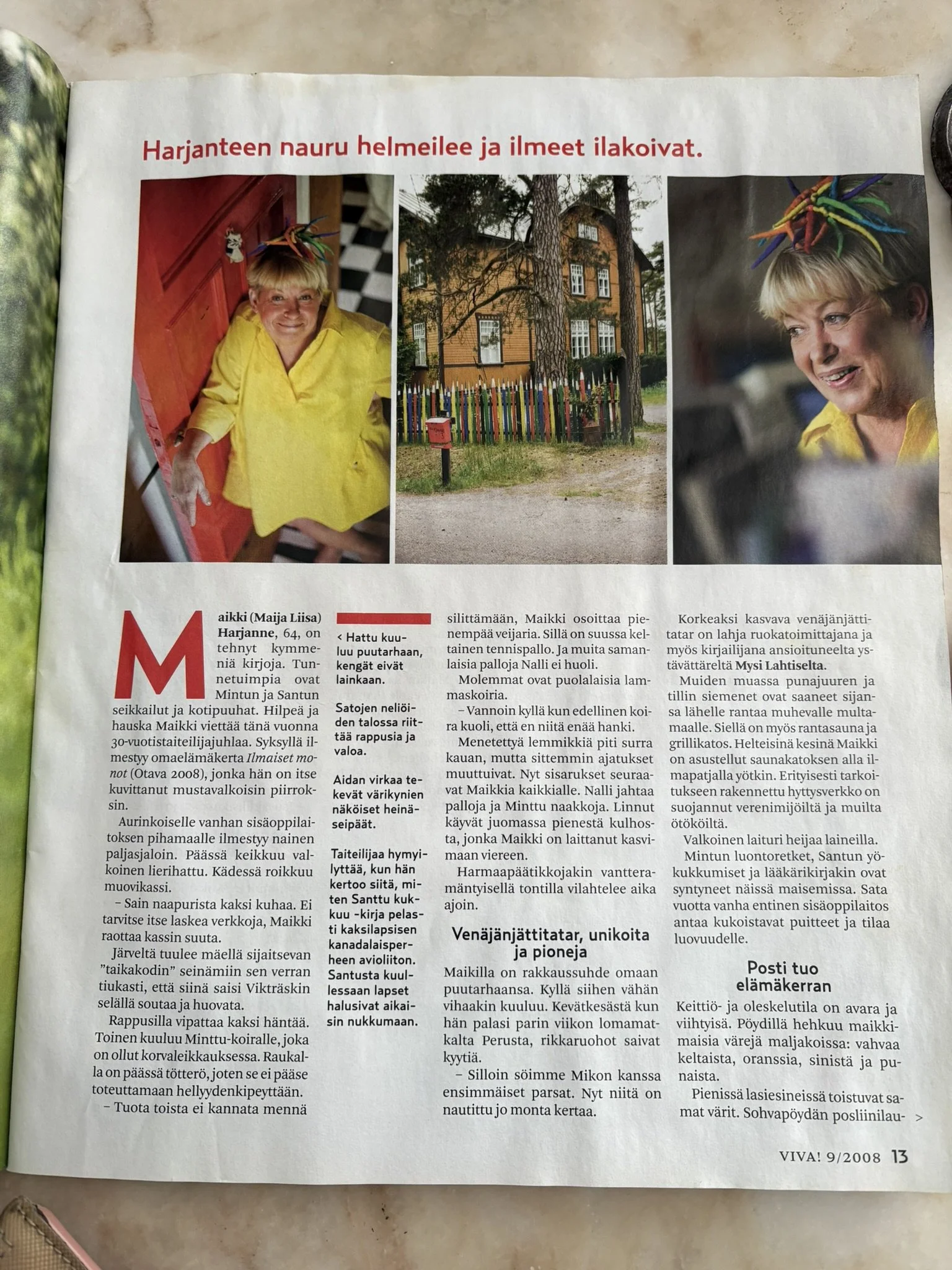 Äitini esitteli taloa mielellään – vaikka välillä väitti muuta. Vieraanvaraisena hän rupatteli toimittajien kanssa joskus useammankin tunnin ja antoipa kerran eräälle valokuvaajalle jalkalampunkin. Kaikki taisivat poistua viimeisin Minttu-kirja kainalossaan.