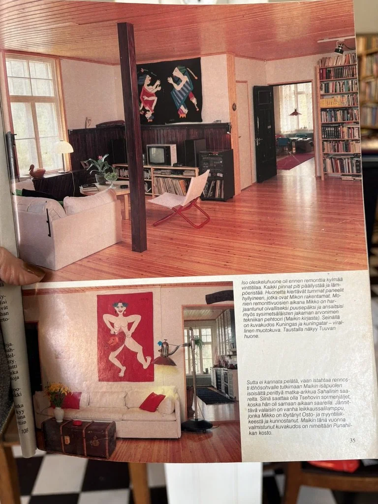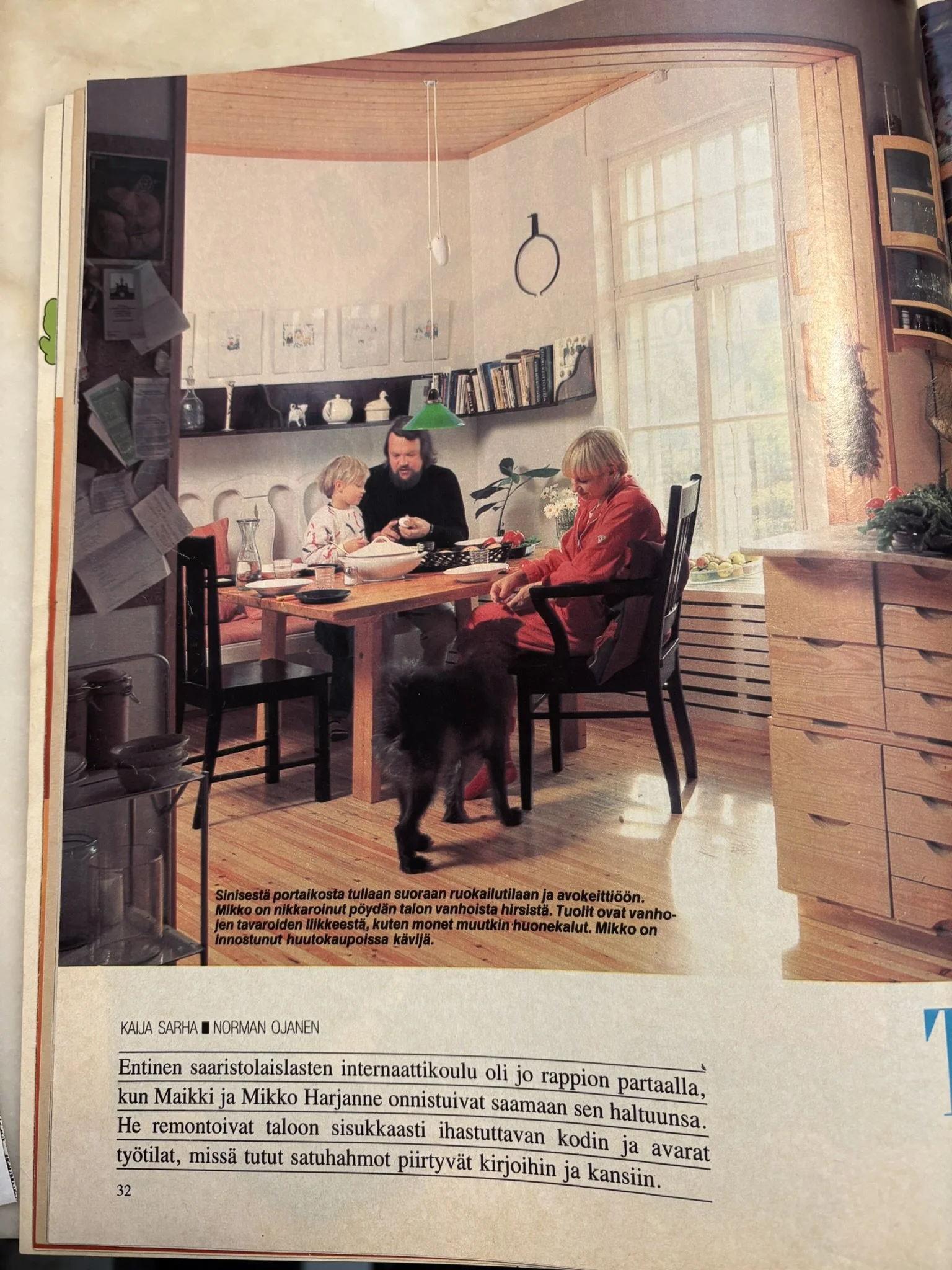 Talo näyttää jutussa myös erittäin siistiltä. Varmasti siksi, että kaikki oli uutta remontin jäljiltä. Ehkä myös siksi, että tavaraa todella oli huomattavasti vähemmän kuin 40 vuotta myöhemmin. Ja todennäköisesti siksi, että vanhempani jaksoivat nelikymppisinä siivota huomattavasti tarmokkaammin kuin myöhempinä vuosinaan.