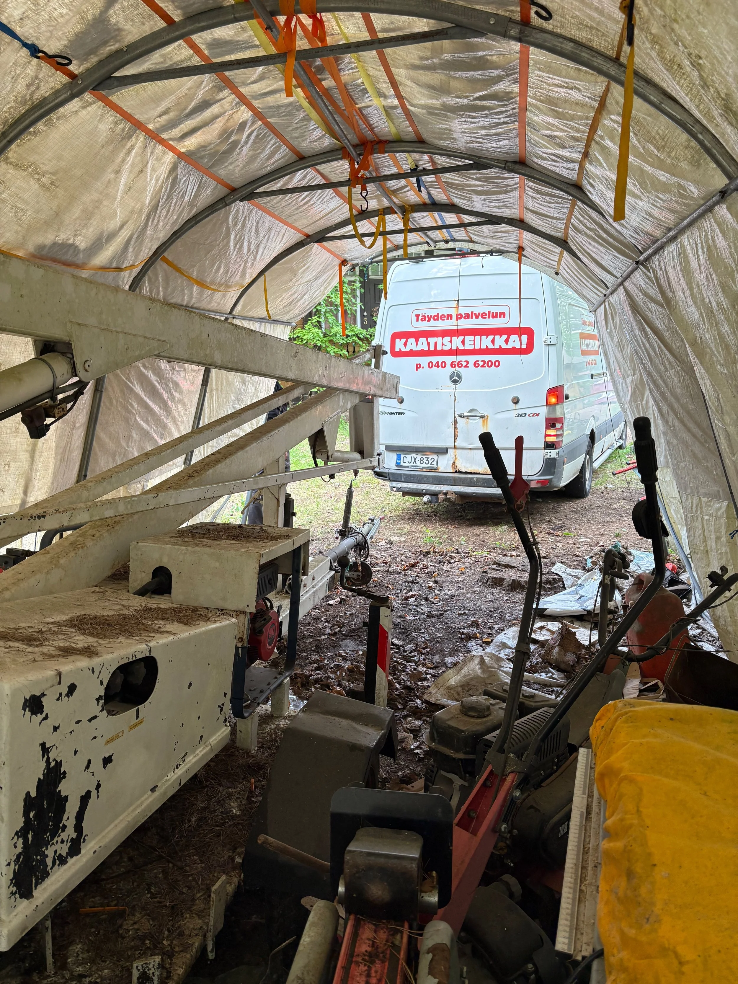 Facebookista löytynyt romunkerääjä Rasmus auttoi hävittämään pakettiautoittain rautaromua sekä isäni pihalle kyhäämän “alppimajan”. Pressukatos oli täynnä rikkinäisiä laitteita, vääntyneitä rakennustelineitä ja muita osia. Rasmus osti myös katoksessa vuosia lojuneen henkilönostimen – sellainenkin kun löytyi nurkista.