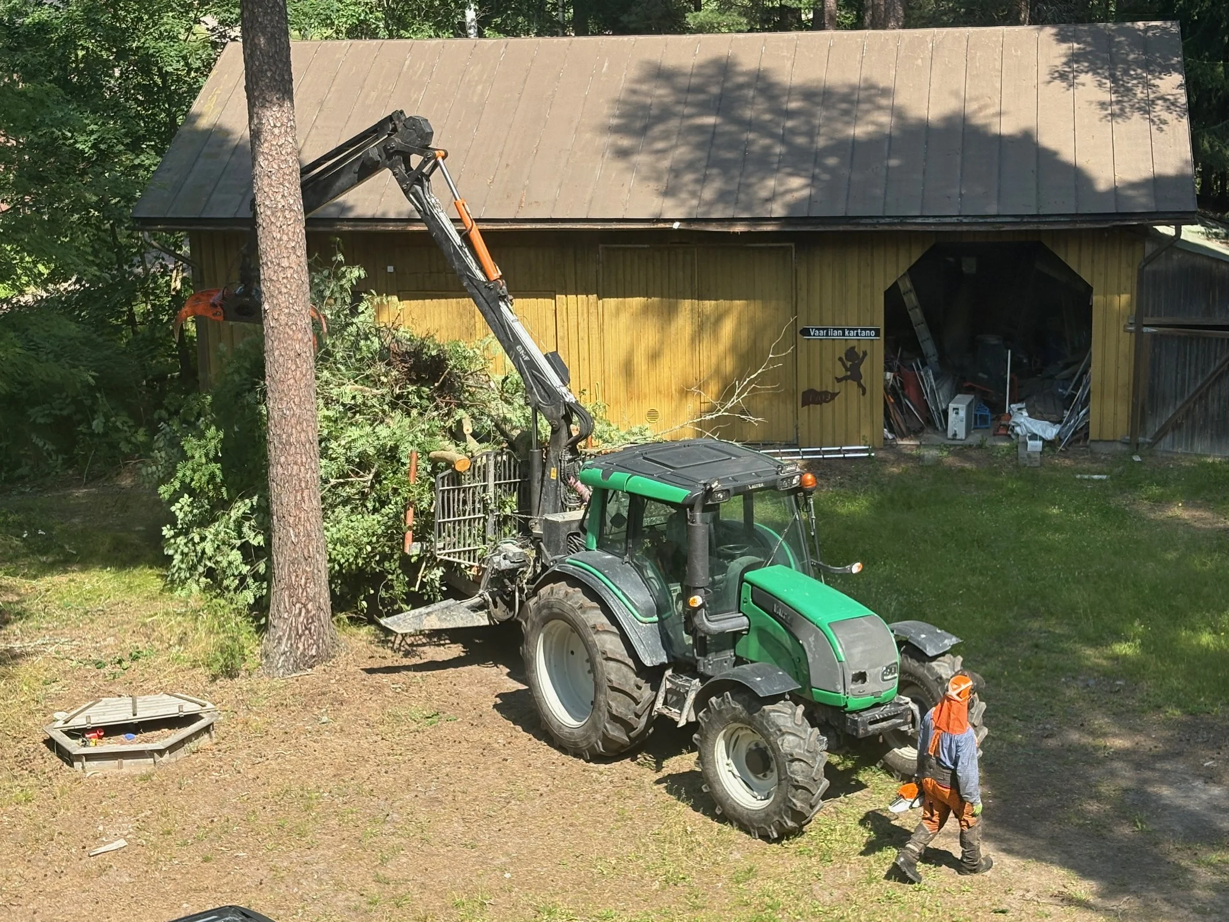 Heinä–elokuussa päätimme kirittää kesähommia. Ensin tontilla kävivät puunkaatajat, jotka olivat olleet naapurilla samoissa töissä. Olin jo aiemmin merkinnyt kaadettavia puita: mm. kasvimaalle kasvaneen pienen metsän, rannan maiseman peittäneet lepät ja talon kylkeä raapivan vaahteran.