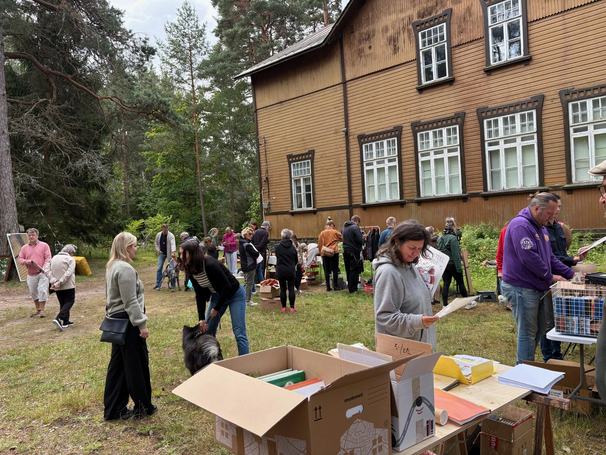 Tavarat vähenivät tasaista tahtia, ja autotallista kannettiin autoihin mitä kummallisempia asioita. Kahvilanpitäjät mainostivat reippaasti tarjontaa, ja mustikkapiirakka sekä muffinssit maistuivat. Pahin sadealuekin väisti kirpputorin.